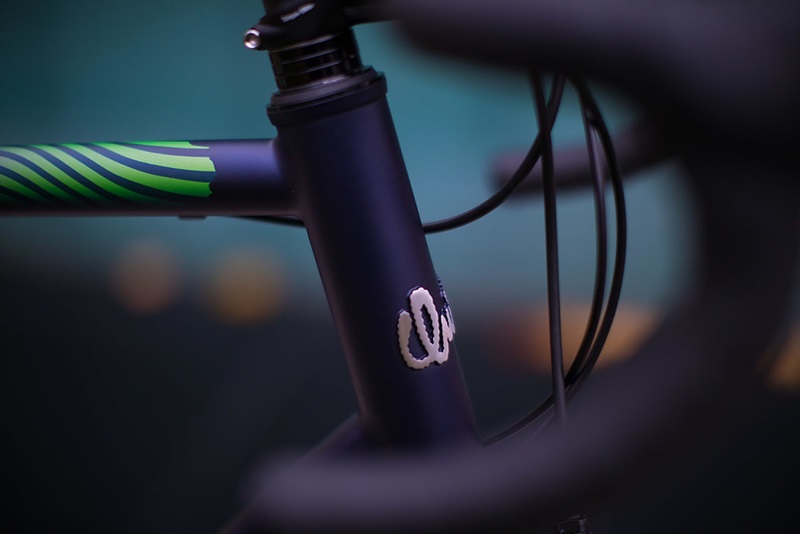 该车涂装出自英国知名工作室 Cole Coatings Workshop,上管处的弯曲渐变条纹灵感源自北极光,下管和前叉的图案则源自北欧地区的鸟瞰图。